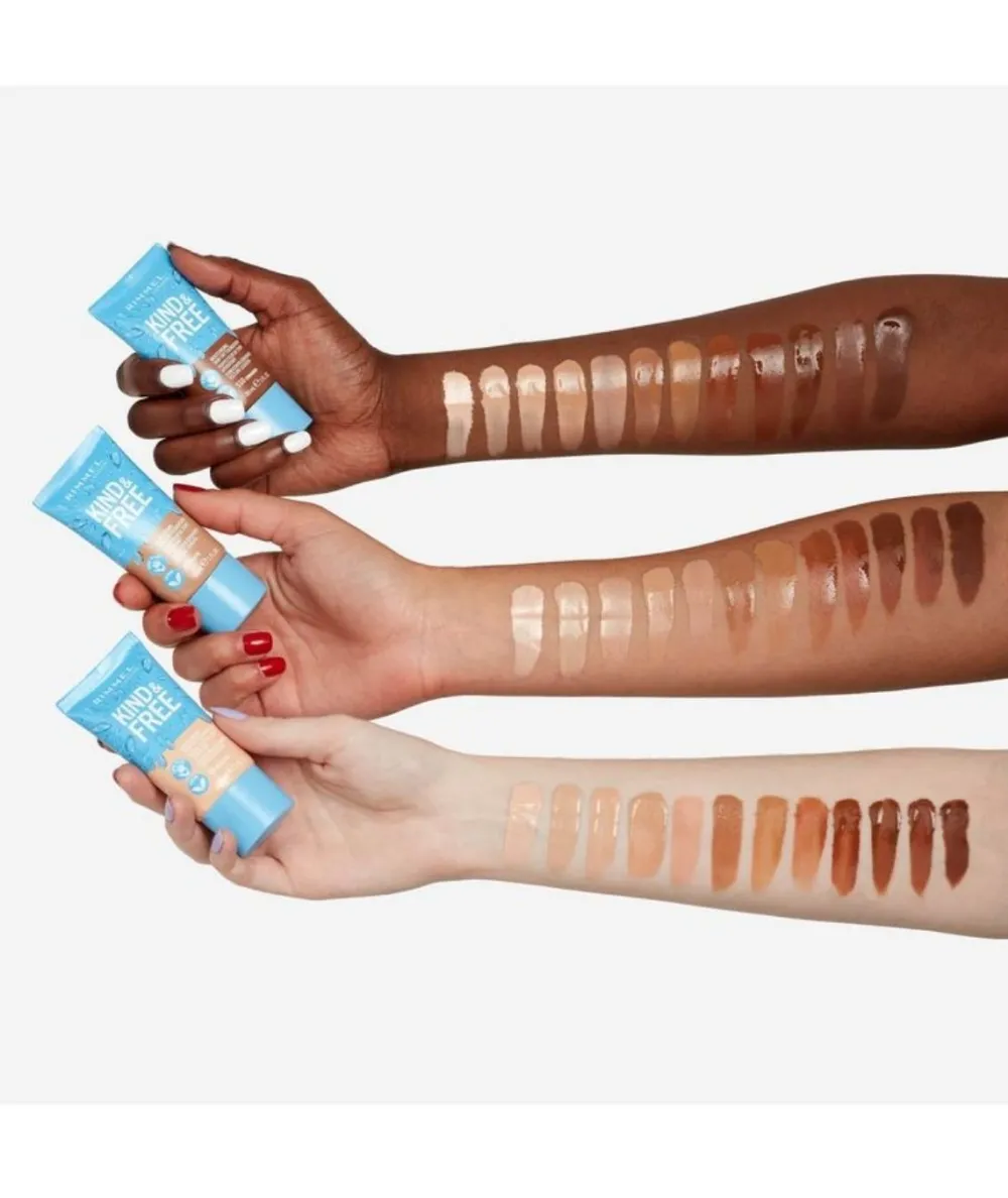 La Primera Linea De Maquillaje Clean De Rimmel, Sin Renunciar A Nada. 100% Vegano Y Respetuoso Con Los Animales Y Con El Planeta. Libre De Fragancias, Aceites Minerales E Ingredientes De Origen Animal. Su Nuevo Kind & Free™ Moisturising Skin Tint Esta Elaborado A Base De Ingredientes 100% Veganos Y Respetuosos Con Los Animales, Que Son Buenos Para Ti Y Buenos Para El Planeta. Hidrata Y Unifica La Piel Para Que Tenga Un Aspecto Radiante Y Saludable. Su Formula Ligera Proporciona A La Piel La Hidratacion Que Necesita. Contiene Un Complejo Antioxidante Con Vitamina E, Pro-Vitamina B5 Y Aloe Vera. Elaborado Con Un 77% De Ingredientes De Origen Natural. Su Textura Ligera Proporciona Un Acabado Natural Al Instante Y Una Hidratacion Que Dura Todo El Dia. No Comedogenico, Probado Por Dermatologos Y Apto Para Pieles Sensibles. Envase Fabricado Con Materiales Reciclados. Consejos De Utilizacion:Paso 1: Para Conseguir Un Resultado Natural Usa Una Pequena Cantidad, Del Tamano De Un Guisante, Y Aplicala Sobre La Piel De La Manera Que Prefieras: Con Un Pincel, Con Tus Dedos O Con Una Esponja A Toques. Para Una Mayor Cobertura, Simplemente Aplica Un Poco Mas De Producto Hasta Conseguir El Aspecto Deseado.