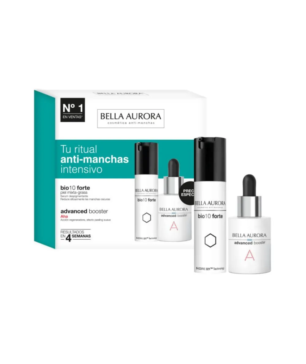Estuche, Ideal Como Regalo De Tratamiento Facial Anti Manchas Y Anti Edad Para El Contorno De Ojos De Bella Aurora. Contiene: Bio10 Forte Tratamiento Antimanchas Intensivo Para Piel Mixta Grasa 30Ml. Actua Directamente Sobre Las Celulas Productoras De Melanina Donde Libera El Activo Despigmentante Obteniendo La Maxima Eficacia. Con Acabado Mate, Sin Brillos. Oil Free. Spf 20. Protección Uva + Uvb + Ir (Infrarrojos) + Hev (Luz Visible O Luz Azul). Aplicar Dos Veces Al Dia, Durante Un Minimo De 8 Semanas. Advanced Booster Aha 30Ml. Cuidado Intensivo De Alta Concentracion Con Efecto Peeling Suave Que Estimula La Renovacion Celular Para Contribuir A Corregir Manchas E Imperfecciones. Con 6% De Ahas, Combinacion Unica De Acido Glicolico, Mandelico Y Lactico De Propiedades Renovadoras, Y Vitamina B3 Que Refuerza La Barrera Cutanea De La Piel, Mejorando Su Hidratacion Y Tolerancia. Textura Fluida De Rapida Absorcion. Aplicar Por La Noche 3 4 Gotas De Producto Sobre El Rostro Antes De La Crema Habitual.