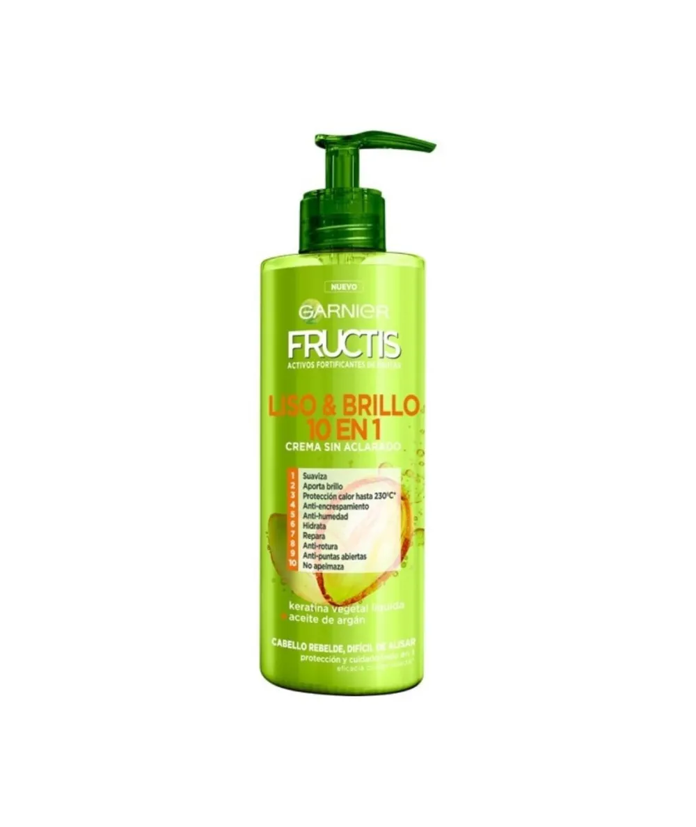 Luce Un Liso De 10. Protege La Fibra Capilar Del Calor Del Secador Y La Plancha Hasta 230º. Fortifica Tu Cabello Gracias A Su Formula Con Aceite De Argan Natural Y Keratina Vegetal Liquida. Ideal Para Cabello Liso, Dificil De Alisar O Rebelde. Di Adios Al Encrespamiento Durante 72 Horas, Con Incluso Un 80% De Humedad. Contiene Extractos De Frutas, Plantas, Vitaminas B3 Y B6, Y Derivado De Proteina De Limon, Para Un Cabello Mas Fuerte Y Sano. Ideal Para El Cabello Liso, Rebelde O Dificil De Alisar. Suaviza, Alisa Y Nutre El Cabello Al Instante, Protegiendo La Fibra Capilar Para Un Efecto Controlado. No Apelmaza El Cabello. Testado Dermatologicamente. Fructis Tiene Un Compromiso Sostenible: El 25% Del Plastico Es Reciclado. Sus Productos Son Hechos En Fabricas Comprometidas Con El Desarrollo Sostenible.