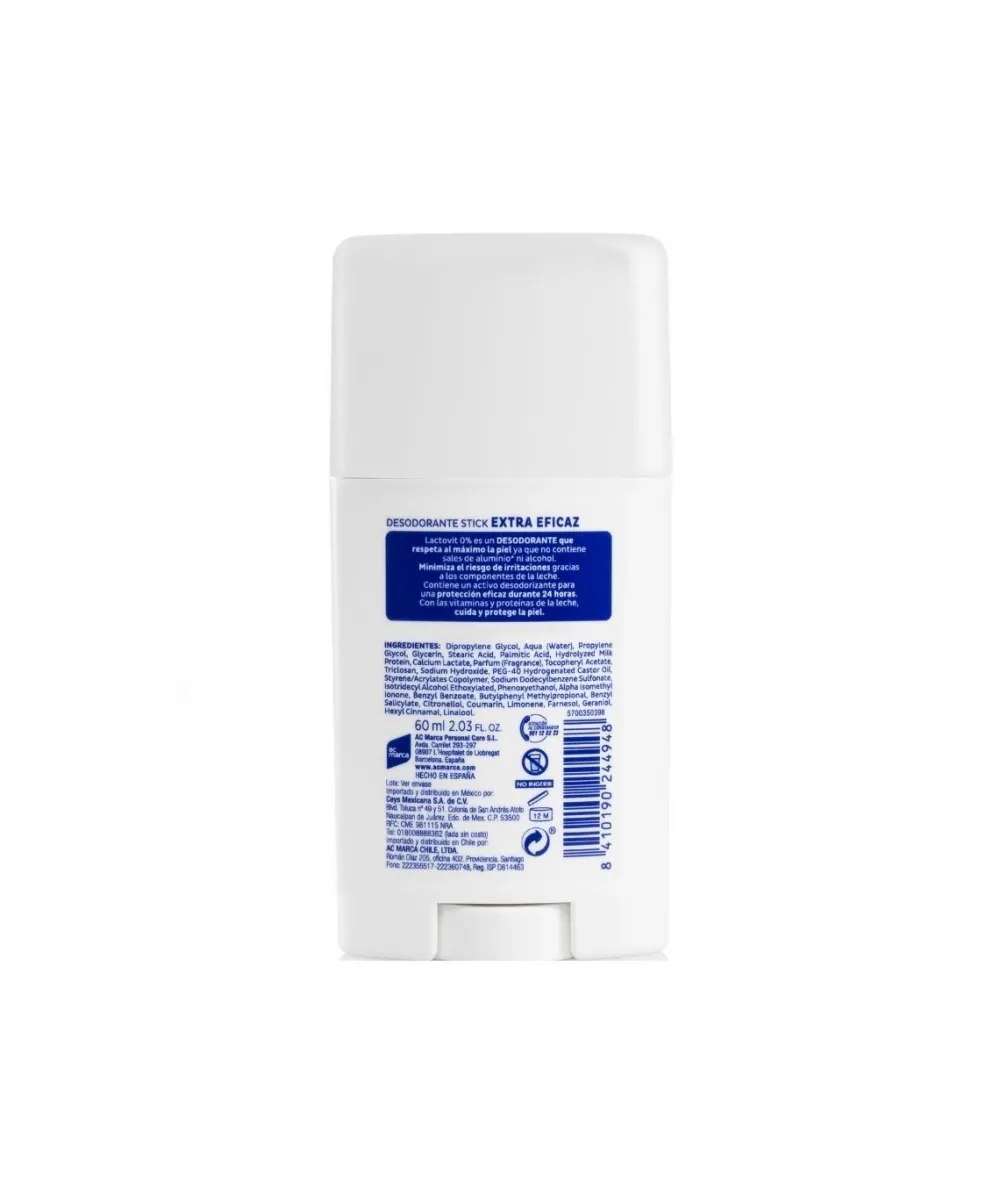 Disfruta Del Desodorante Extra Eficaz 0% En Stick De Lactovit. Perteneciente A La Gama 0%, Esta Elaborado Sin Alcohol Y Sin Sales De Aluminio, Una Eficacia Respetuosa Con Tu Piel Mientras Alivia Las Irritaciones. Dia Tras Dia Sentiras Tus Axilas Suaves Y Secas Gracias A Su Patentada Tecnologia Con Componentes De La Leche Y Con Una Eficaz Duracion De 48H. Los Desodorantes Lactovit Cuidan Tu Piel Con Lo Mejor De La Leche: Sus Formulas Incorporan Una Tecnologia Unica Que Ofrece El Equilibrio Perfecto Entre Eficacia Y Cuidado.