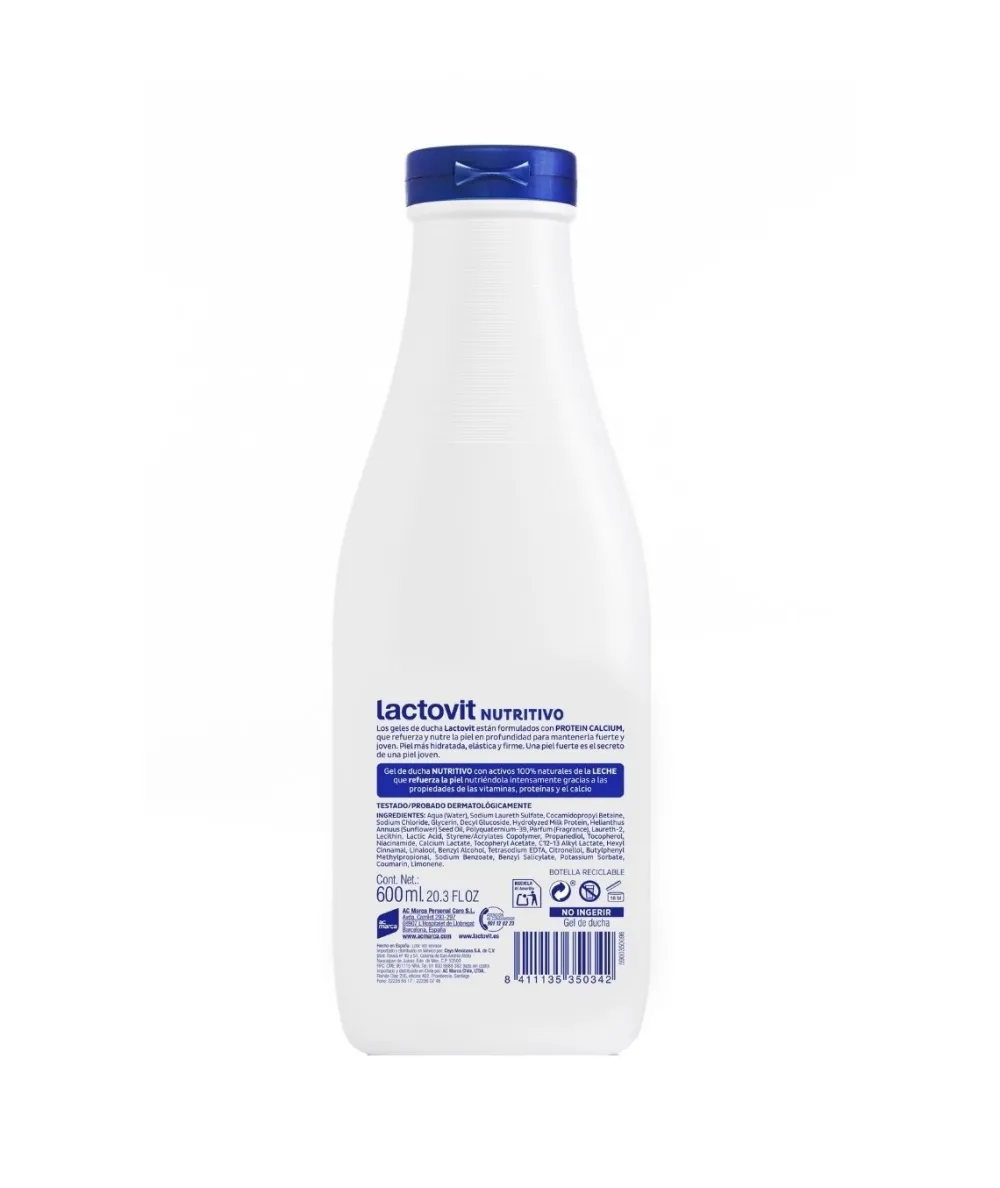 Gel De Ducha Lacteo Nº1 Con Propiedades Nutritivas Y De Uso Familiar, Para Pieles Normales Y Secas Que Necesitan Un Extra De Hidratacion. Gracias A Las Vitaminas, Proteinas Y Calcio De La Leche, Refuerza La Piel Nutriendola Intensamente. Formulado Con Protein Calcium, Que Refuerza Y Nutre La Piel Para Mantenerla Fuerte Y Joven. Piel Mas Hidratada, Elastica Y Firme. Una Piel Fuerte Es El Secreto De Una Piel Joven. Desde El Primer Dia, Notaras Una Piel Hidratada, Elastica Y Fuerte, Ademas De Disfrutar Durante Todo El Dia De Su Delicado Perfume. Compromiso Lactovit; Activos 100% Naturales De La Leche Y Altamente Biodegradables, Mejorando La Reciclabilidad De Nuestros Envases Y Cuidando Del Medio Ambiente.