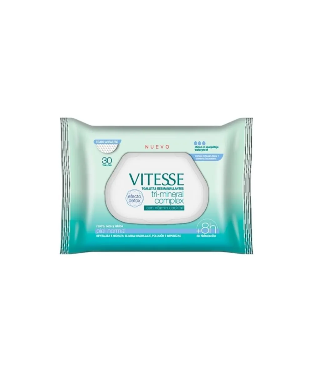 Toallitas Desmaquillantes Tri-Mineral Vitesse. Desmaquillan Y Limpian Tu Rostro De Forma Rapida Y Eficaz, Aportando A Su Vez Una Hidratacion De Larga Duracion. Con Efecto Detox Y Vitamin Cocktail.
